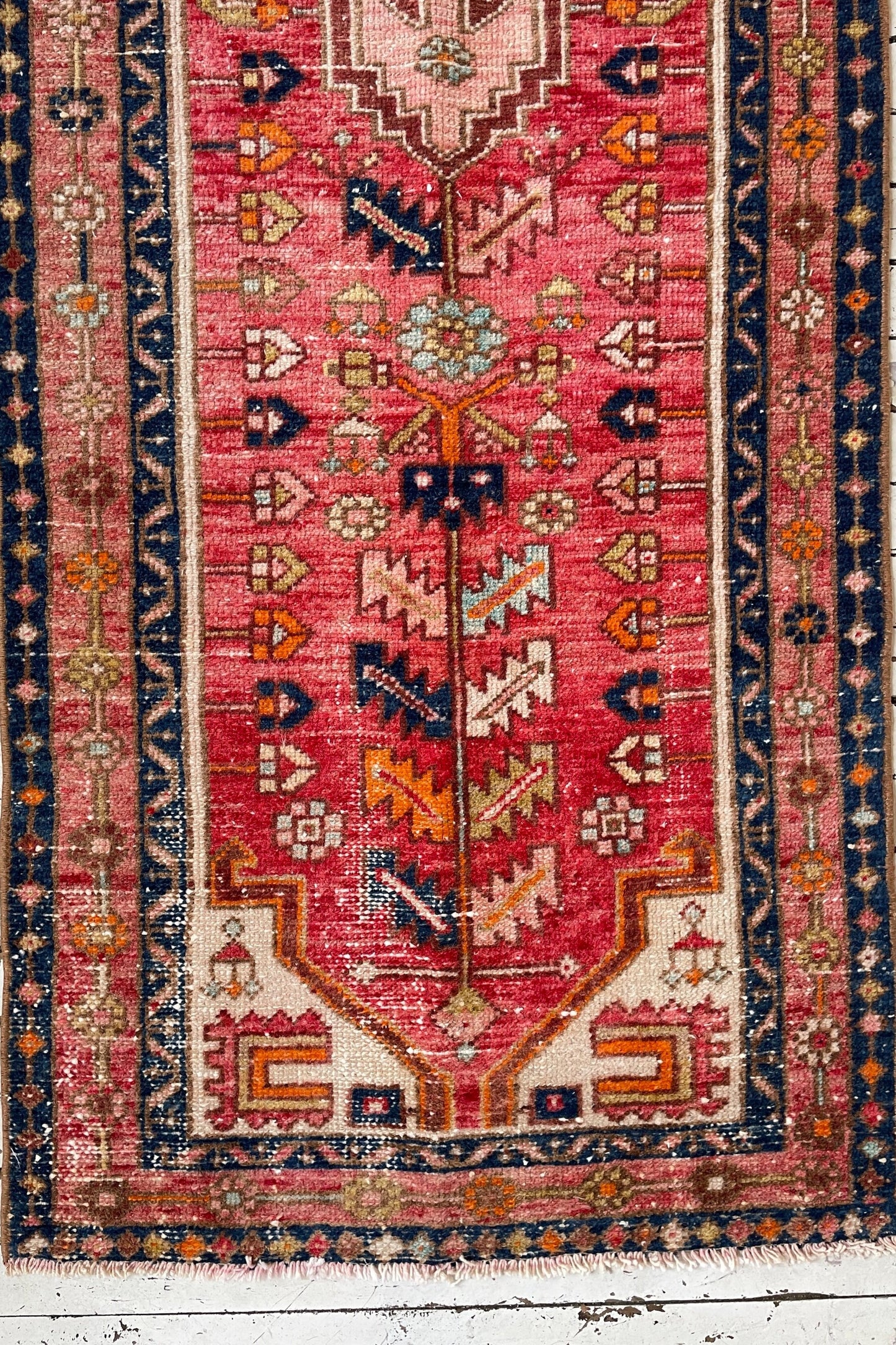 Origin: Iran, HamadanAge: Vintage, about 50 years oldPile: MediumMaterials: 100% WoolColors: Pink, Blush, Coral, Navy, Orange, Light Green
