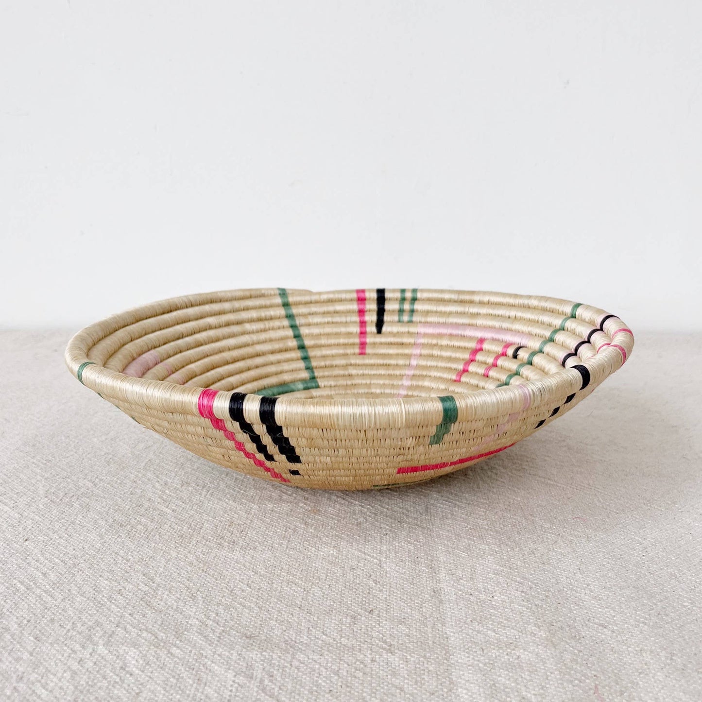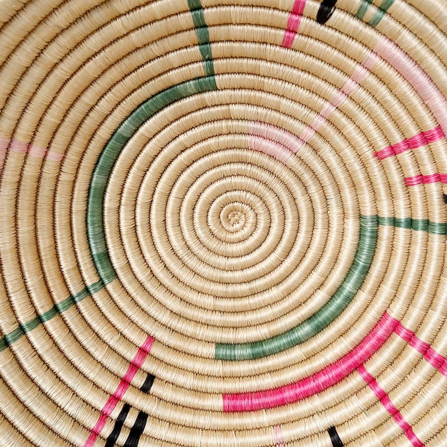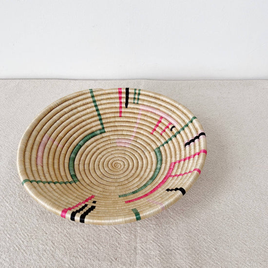 This sisal, woven basket is approximately 12" in diameter and woven by our artisans in Gitarama, Rwanda. The sisal is woven around sweetgrass, a fragrant grass with a subtle sweetness. In addition to making a beautiful table display, these baskets can also be hung as art. There is a loop on the back for hanging.