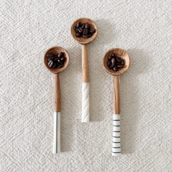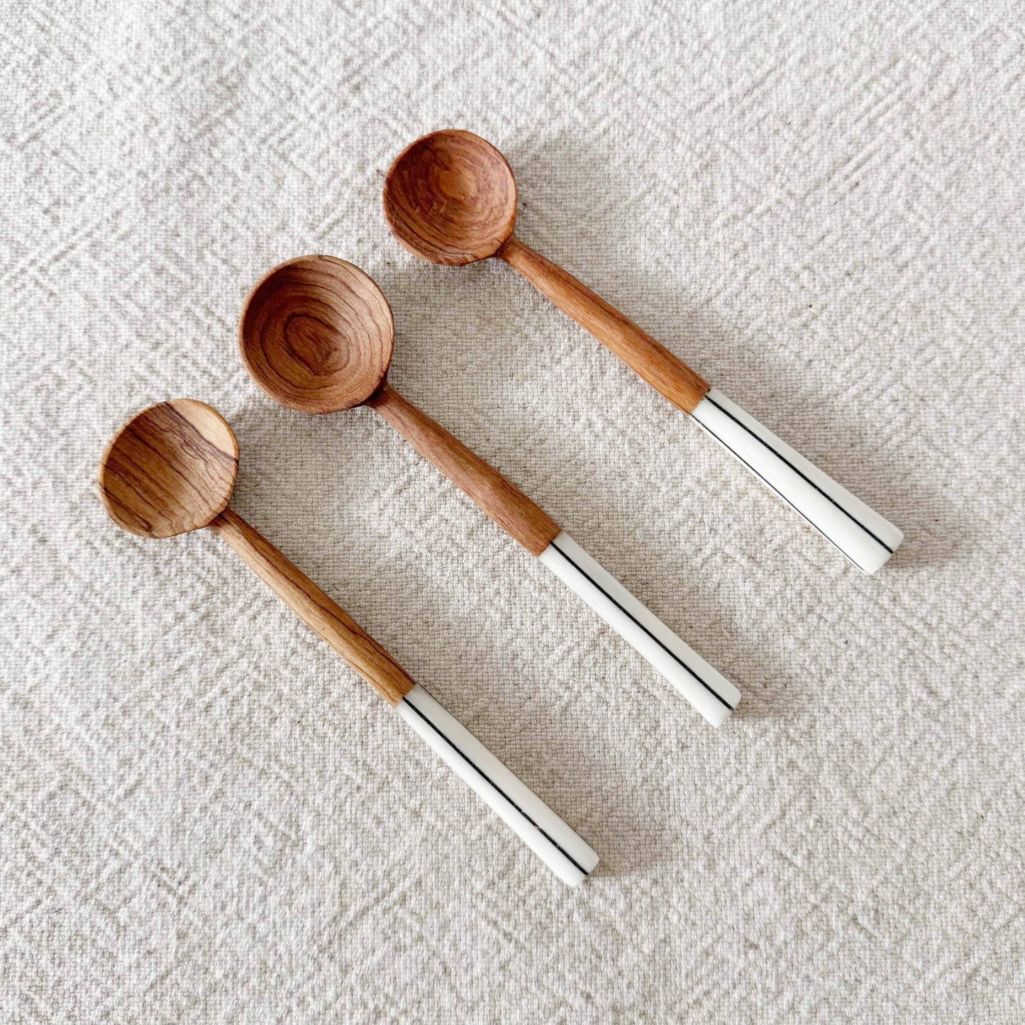 These cute, olive wood spoons are hand-carved in Kenya and feature a bone handle. They can be merchandised on their own or pair them with a bag of coffee for a great gift or alongside kitchen items in a gift set. Wild olive wood has a rich grain and is indigenous to East Africa. It is typically used in kitchen products because of its durability. ~6.5" long. To care for these spoons, wash with mild soap and water. Periodically rub with mineral oil. The wood grain on each piece will vary.